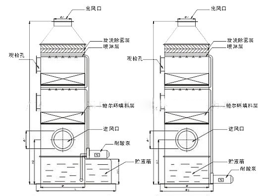 废气喷淋塔吸收处理工艺为:车间产生的废液经吸风罩吸收汇集到各自吸收塔中,与塔中吸收液逆流接触后,废气均被吸收袭来,净化后的气体在净塔中初五装置除雾排空,吸收液循环使用。喷淋化学中和原理:在废液中加入弱还原剂,可将有毒的氮氧化物还原成无毒无害的惰性气体。如亚硫酸盐、尿素、氨基磺酸等还原剂。
